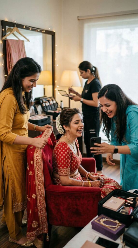 These moments often include laughter between friends during the mehendi, nervous excitement before the bride’s entry, emotional reactions from parents during the ceremony, and spontaneous celebrations on the dance floor. These are the moments where candid wedding photography truly shines, capturing genuine smiles, teasing between friends, and the excitement building before the wedding ceremony.