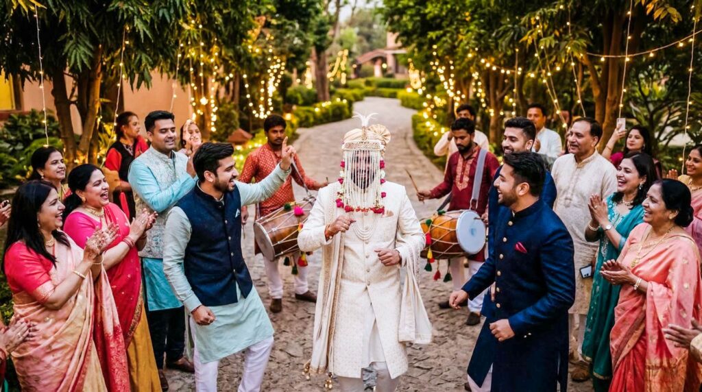 The baraat is one of the most energetic parts of an Indian wedding. The groom arrives with friends and family dancing to dhol beats and music while the entire procession moves toward the wedding venue. For a candid wedding photographer in Faridabad, the baraat offers incredible moments of movement, laughter, and spontaneous celebration that reflect the true excitement of the wedding day.