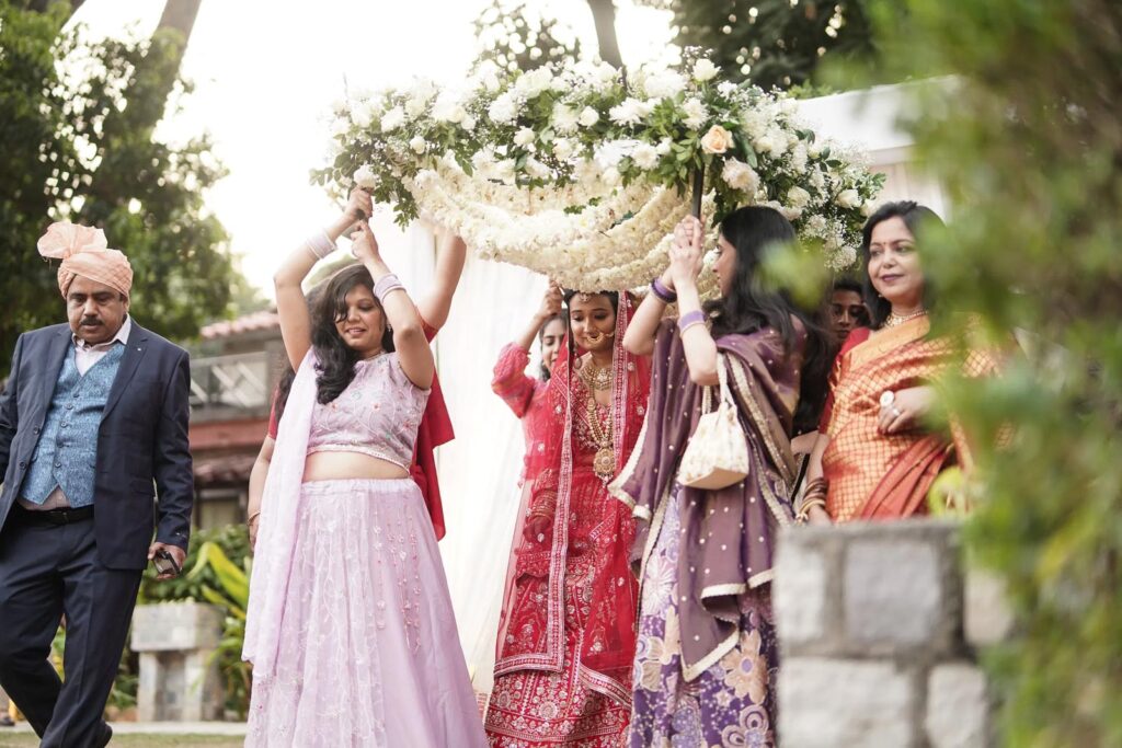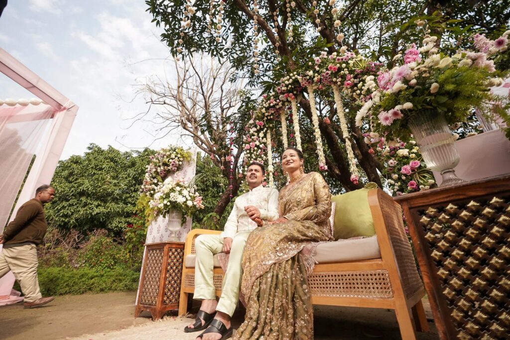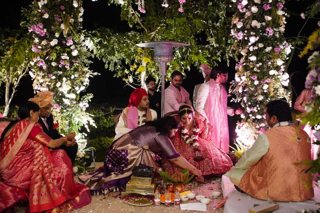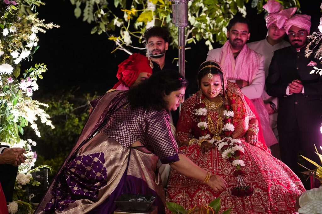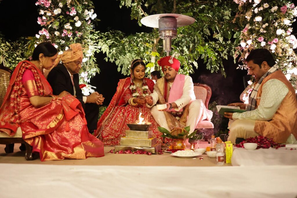 Set within the open landscapes of Jim Corbett, Vatsala and Pranav’s wedding ceremony was designed to feel both grounded and expansive. The mandap, framed by natural surroundings and soft light, created a setting that felt calm, intimate, and visually striking. Every ritual unfolded with a sense of ease, allowing moments to flow naturally while maintaining a strong visual narrative. As Faridabad wedding photographers, capturing this ceremony meant balancing scale with emotion, documenting both the grandeur of the setting and the subtle interactions that defined the experience.