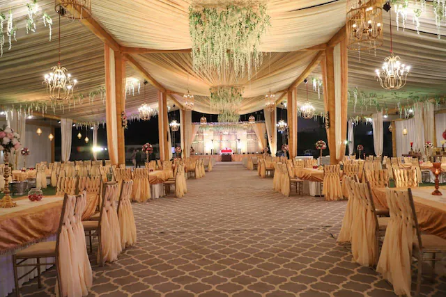 Couples often host their mehendi or cocktail events outdoors while keeping the main wedding ceremony inside the banquet hall.